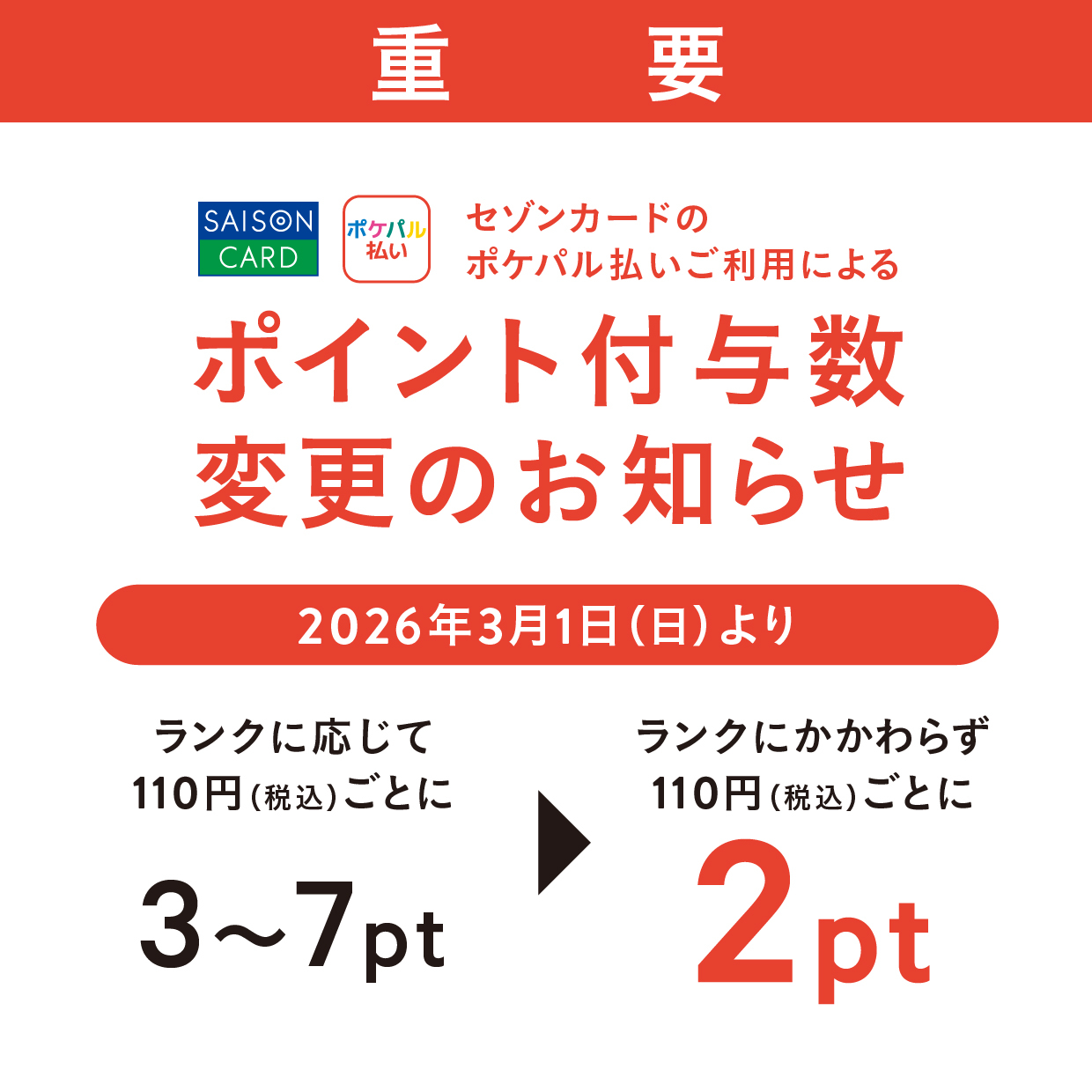 เราขอแจ้งให้คุณทราบว่าจำนวนคะแนน PARCO ที่ได้รับเมื่อใช้การชำระเงิน Pokepal ด้วยบัตร Saison (รวมถึงบัตร PARCO รุ่นเก่า) จะมีการเปลี่ยนแปลงดังต่อไปนี้ ตั้งแต่วันอาทิตย์ที่ 1 มีนาคม 2569 เป็นต้นไป